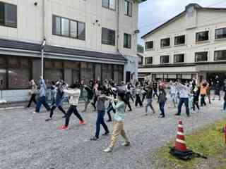 予定より少し遅れて始まりました。 保健係の体操です。 みんな、昨日はよく眠れたでしょうか? やや、お疲れの様子です。