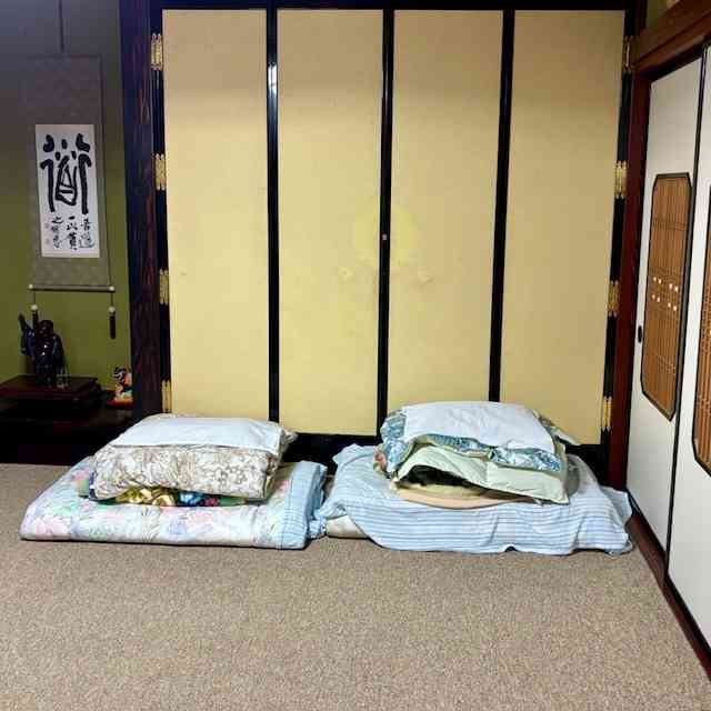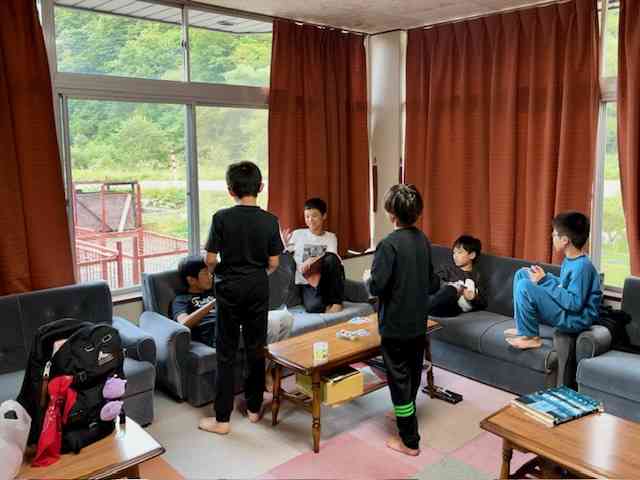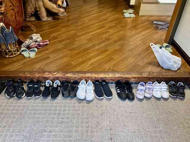 夕方のフリータイムは、この宿でもUNOでした。 2枚目の写真は、ある宿の玄関の様子です。さすがです。 そして3枚目。別の宿では、お布団がきちんとたたまれていました。指導員さんたちも、熱心に子どもたちを指導してくださっています。