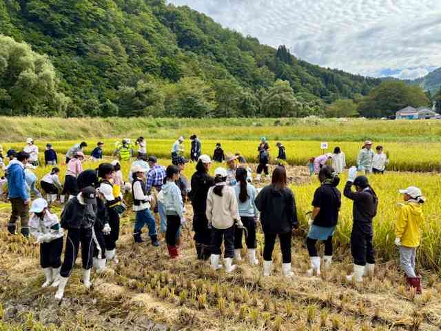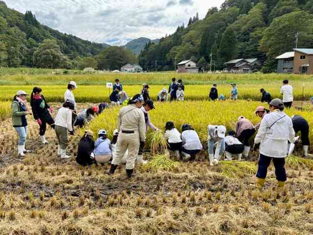 利賀村の皆さんが、講師として稲刈りのやり方を教えてくださいました。昨日の箸づくりでは小刀を使うのもおっかなびっくりでしたので、鎌を使うときも気をつけて作業してくださいね。