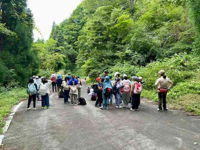 昔の人は、この一本杉を目印にして峠を越えたそうですが、今では木々が生い茂り、一本杉はあまり目立たなくなってしまったようです。森を抜けたあとは舗装された道を歩く予定でしたが、ちょうどマイクロバスがお迎えに来てくれたため、ここからはバスでの移動となりました。