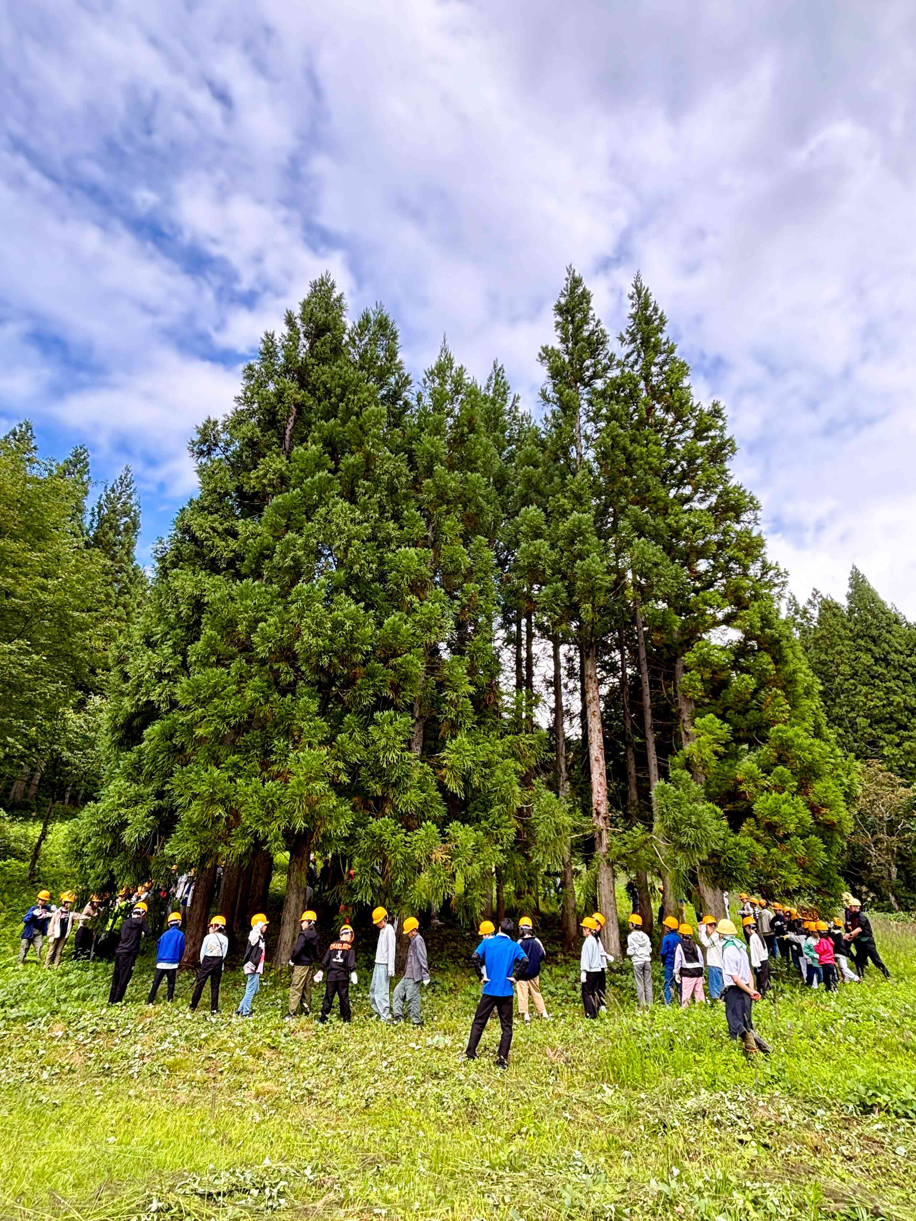 記念に植えられた木だそうです。どういうわけか、この場所だけ木が密集しているように見えました。この中からどの木を間伐するのか、その判断の仕方を教えていただきました。間伐の意味を知っていた子でも、実際に『どの木を切るのか』を考えるのは難しかったようで、みんな真剣に木を見比べていました。