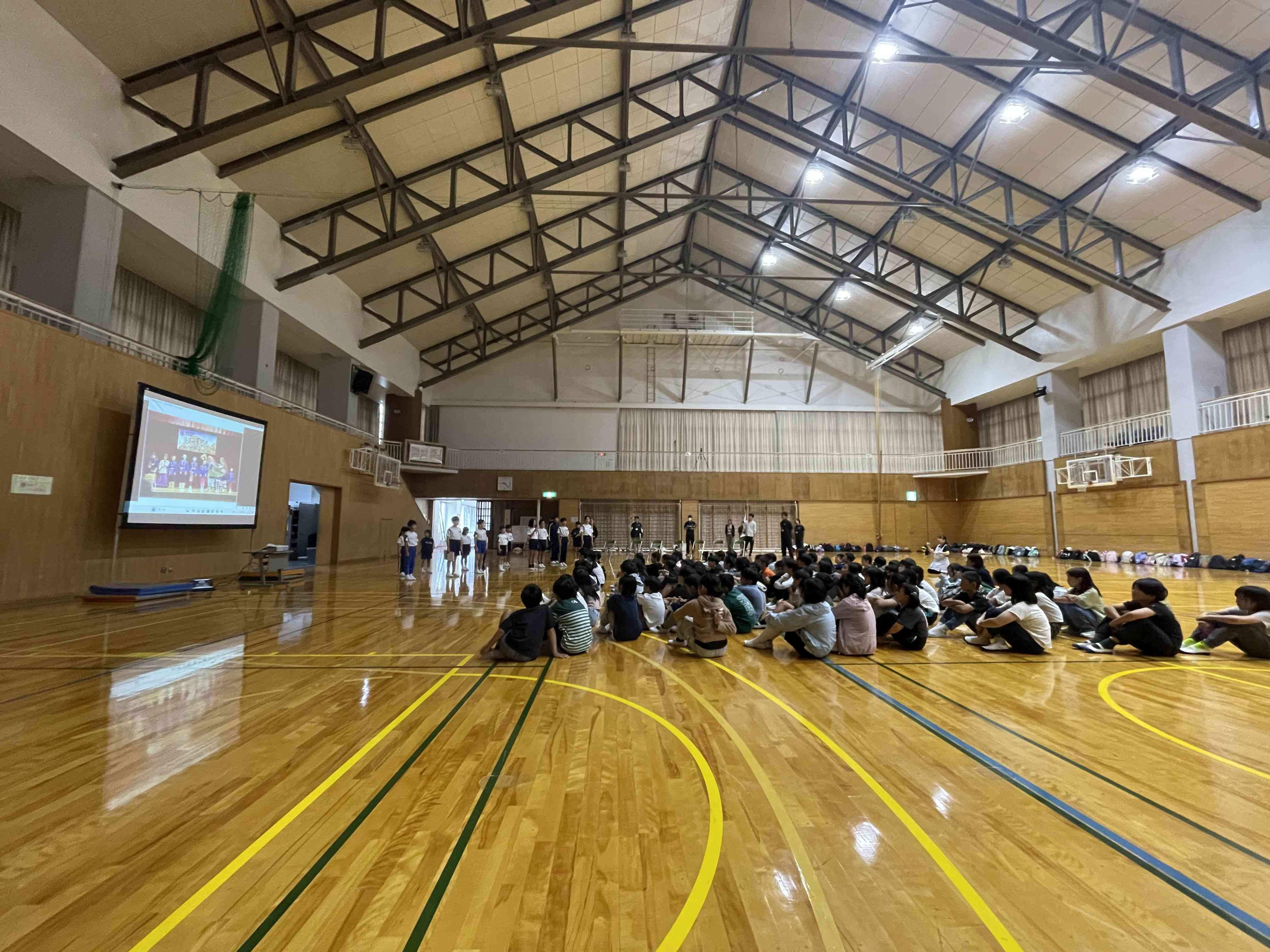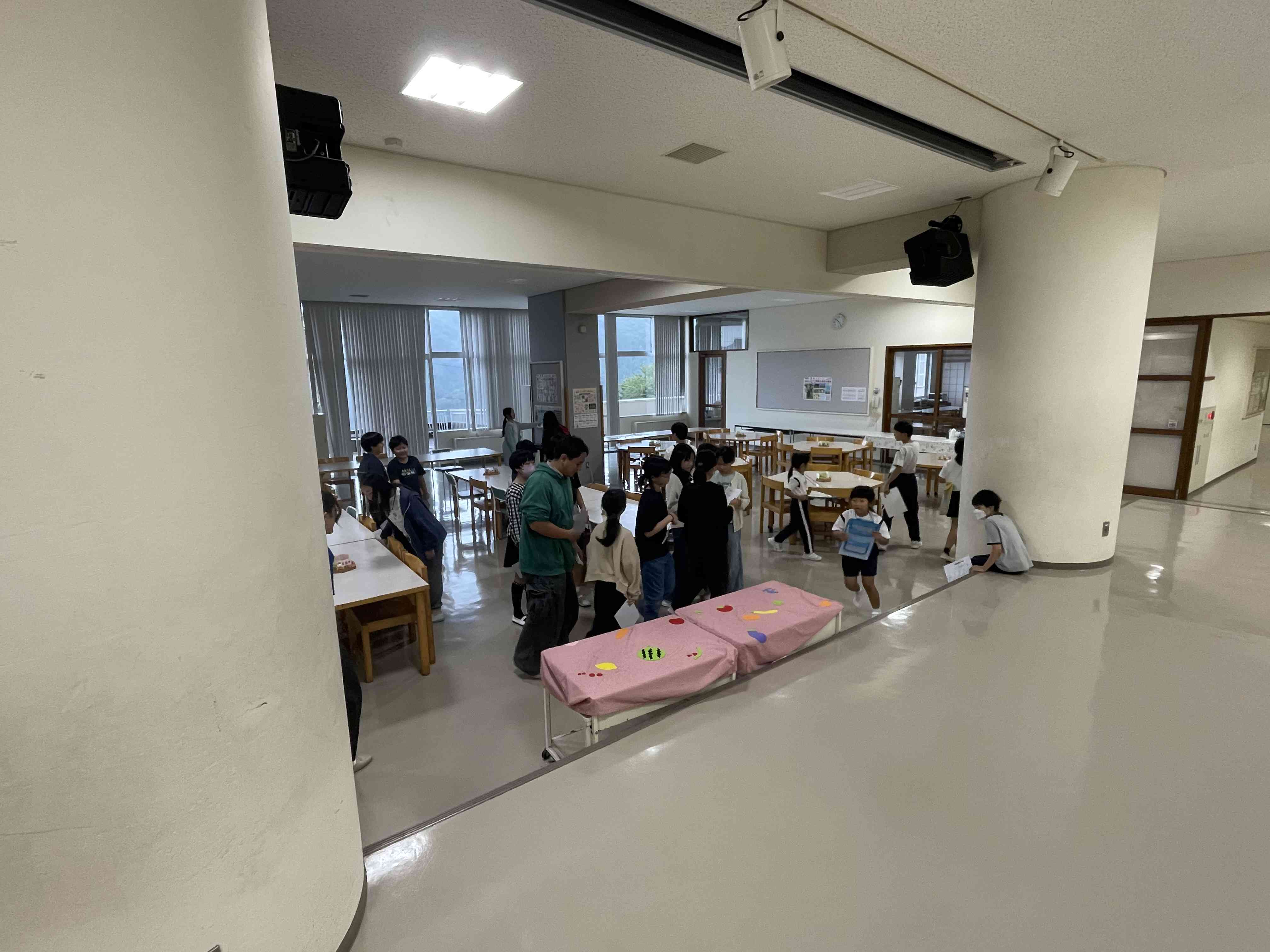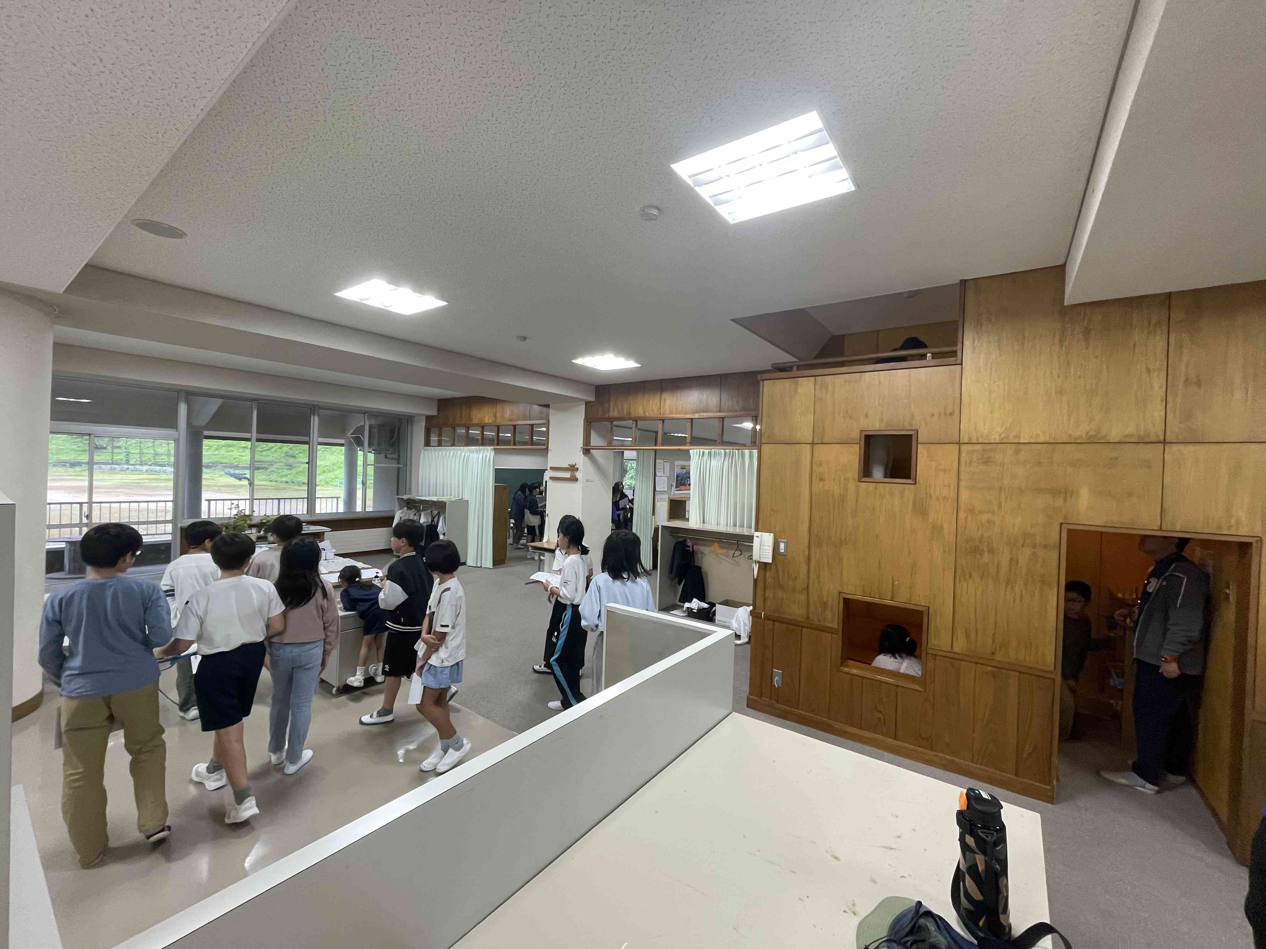 利賀学舎に到着しました。 横断幕で歓迎してくださいました。 利賀学舎の皆さんが、学舎のことを分かりやすく説明してくれました。 そのあと、利賀学舎ツアー(施設見学)に行き、広い校舎と充実した施設に二小の子どもたちは感動していました。