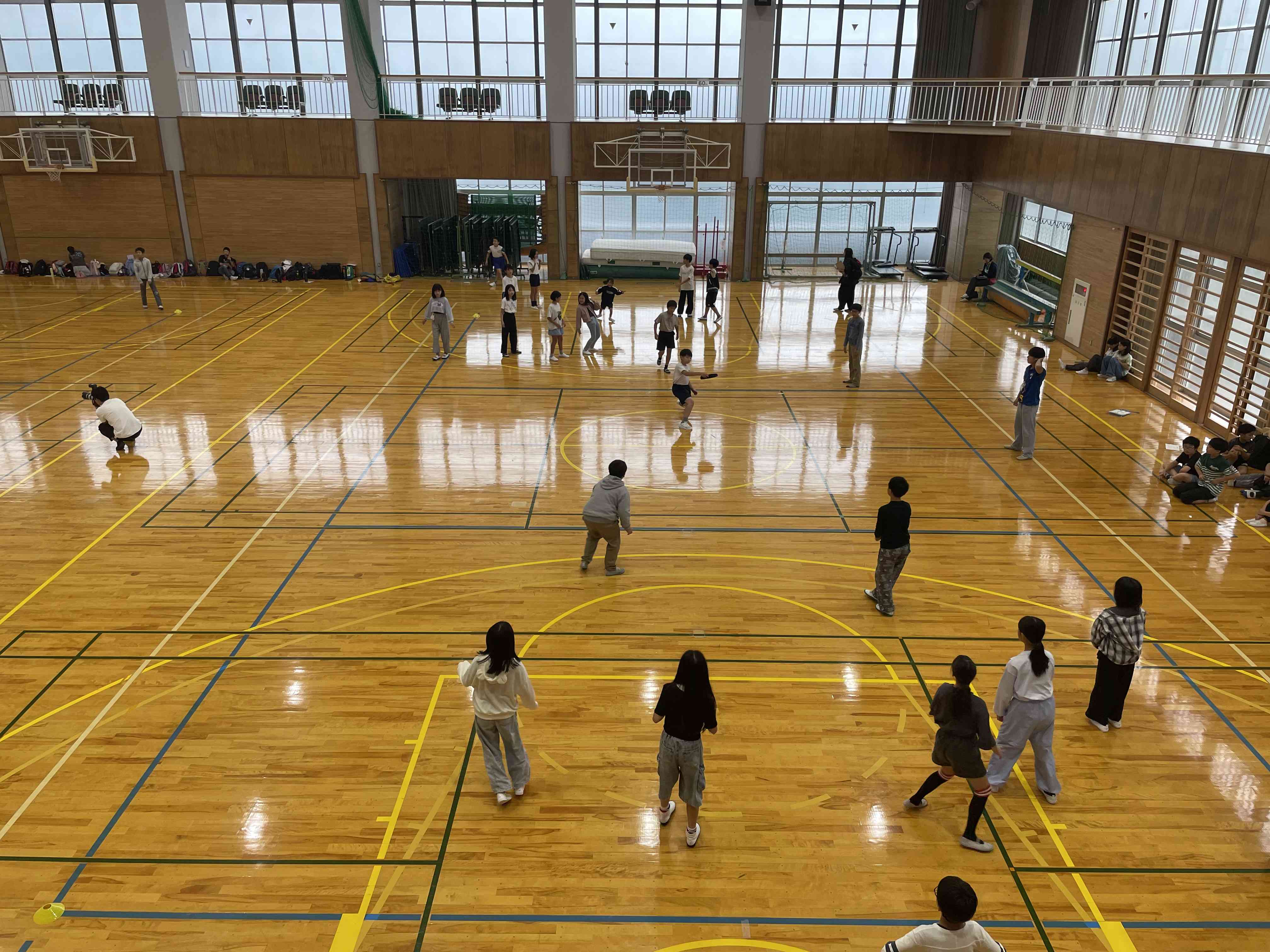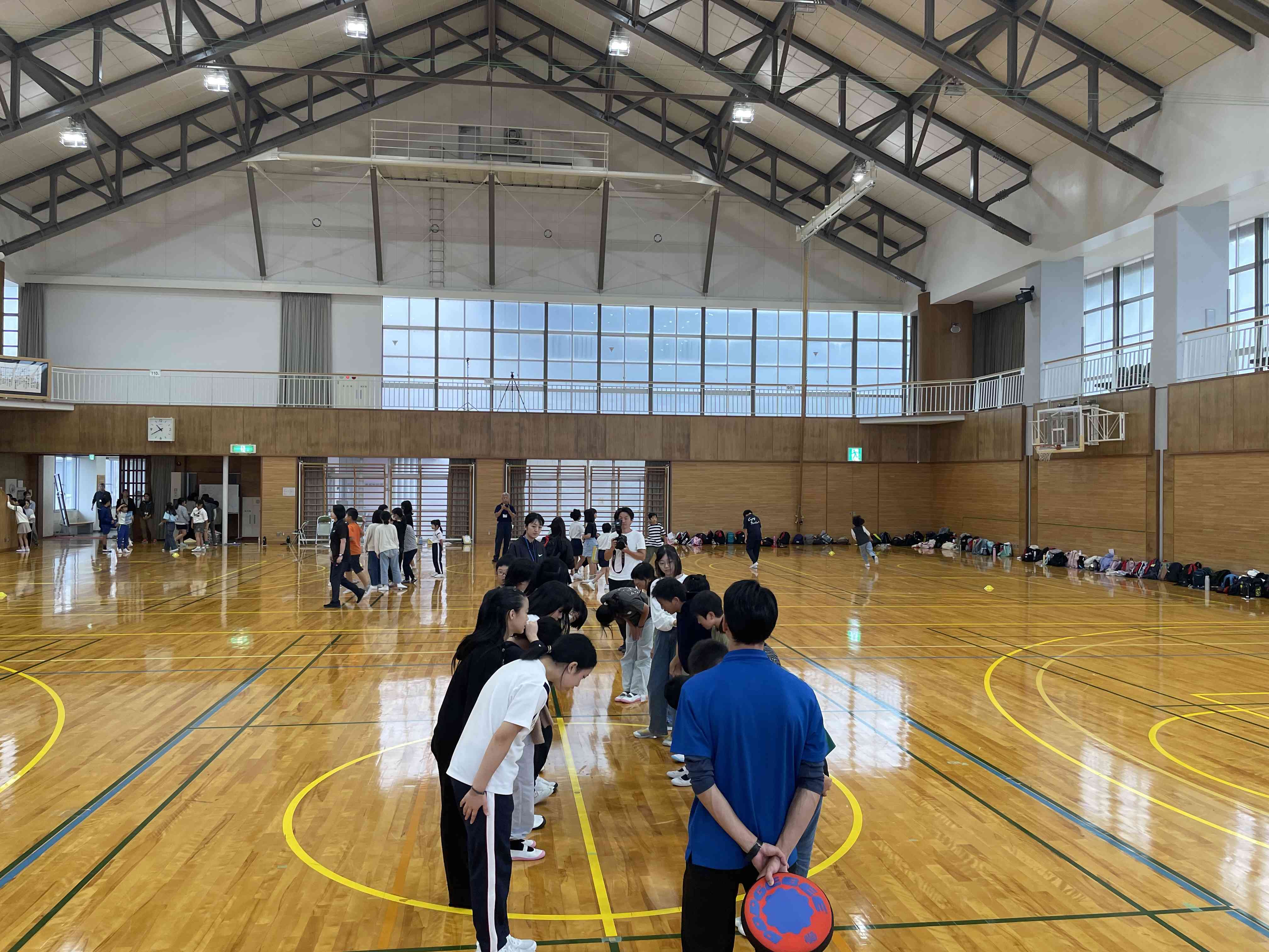 利賀学舎ツアーのあとはドッヂビーで交流を深めました。 班ごとに対戦し、二小の子から利賀学舎の子へのパスがあったり、利賀学舎の子に二小の子が当てられたりと、楽しみながら交流を深めていました。